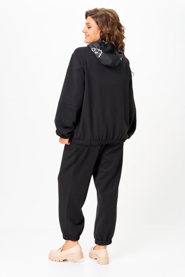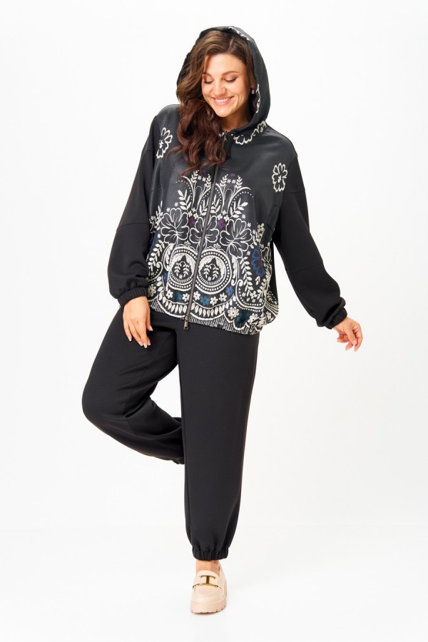 Костюм женский спортивный, состоящий из куртки и брюк. Костюм выполнен из 2-х видов ткани. Куртка с капюшоном свободного кроя на талии с прорезными карманами, застежка молния.Низ рукавов и низ куртки на эластичной манжете. Брюки заужены к низу, с карманами. Брюки на резинке по талии. Низ брюк на манжете с резинкой. Бережная стирка при 30 градусах!