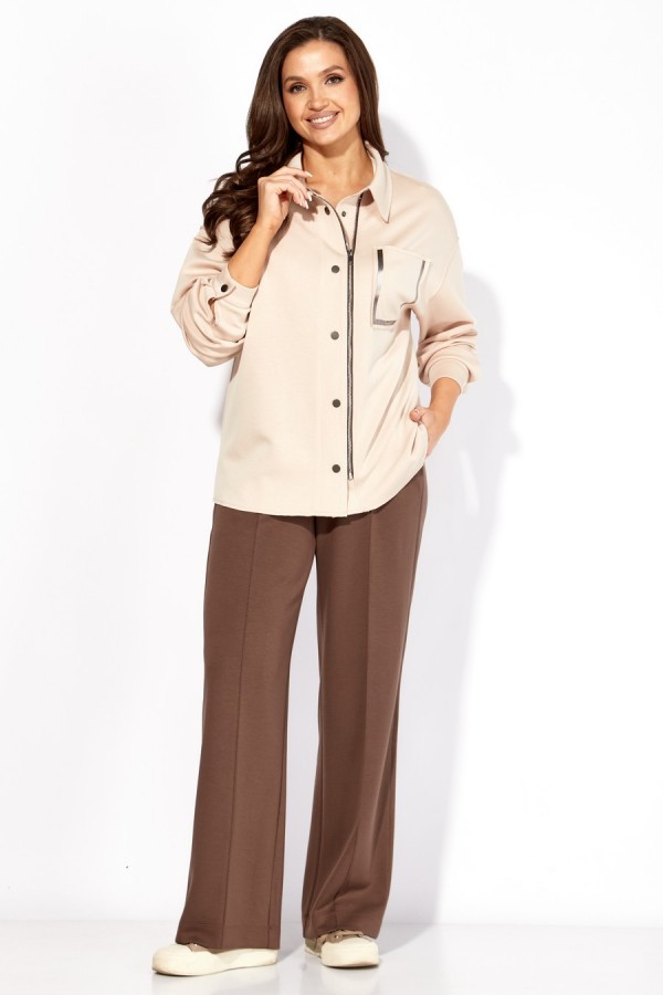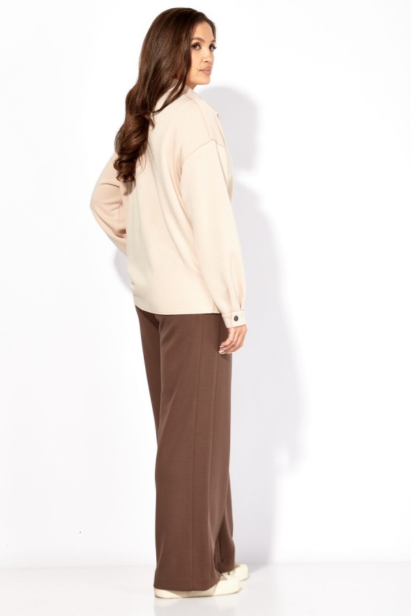 Костюм женский, 2х предметный, изготовлен из трикотажного полотна TENSEL , состоящий из рубашки и брюк. Рубашка прямого силуэта с длинным рукавом. Рукав со спущенной линией плеча. По низу манжета, с застежкой на кнопку. Застежка центральная, с отрезной планкой на кнопки и чуть смещенную тесьму «молния» Воротник рубашечный, на стойке. На левой полочке карман, акцентированный принтом. Плечевые швы, проймы, воротник и низ изделия выполнеы с открытым срезом, с закрепляющей строчкой. Брюки широкие, прямые. По боку подрезной лапмас и карманы. По центру переда пристрочены защипы «стрелки» Пояс притачной, с гладкой центральной частью, дальше резинка по кругу.