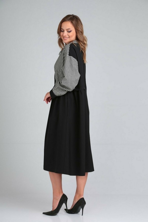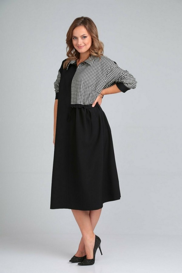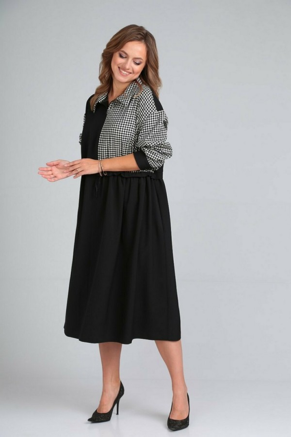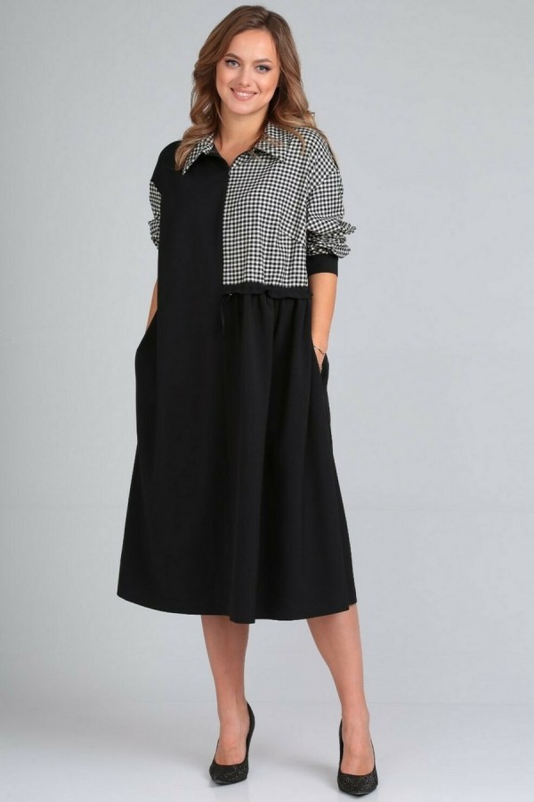 Платье свободного силуэта в стиле «бохо», выполнено из двух тканей-компаньонов. Воротник отложной, застежка - центральная потайная молния до линии талии. Перед платья ассиметричный - правая половинка цельнокроеная, левая - отрезная по линии талии, нижня часть лифа с кулисой и фиксатором. Линия плеча спущена, рукав рубашечный на манжете с пуговицей. Спинка ассиметрична, со средним швом: правая часть цельнокроеная, левая-отрезная по линии талии. В боковых швах потайные карманы. Длина изделия по спинке 119 см. Ширина изделия на уровне глубины проймы в 56р-64 см, в 58р-66 см, в 60р-68 см, в 62р-70 см, в 64р 72 см. Длина рукава с плечом 75 см. Ширина изделия на уровне линии бедер в 56р-84 см, в 58р-86 см, в 60р-88 см, в 62р-90 см, в 64р 92 см.