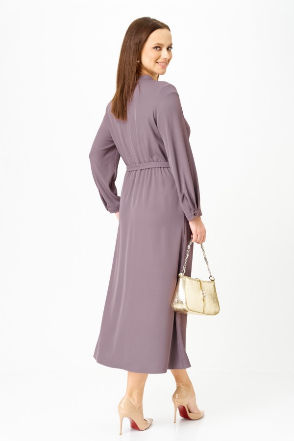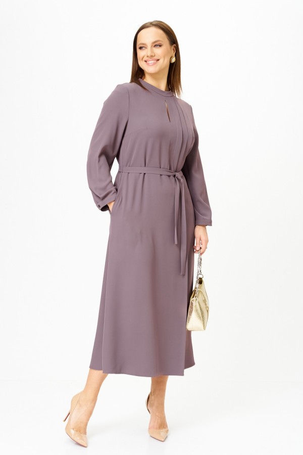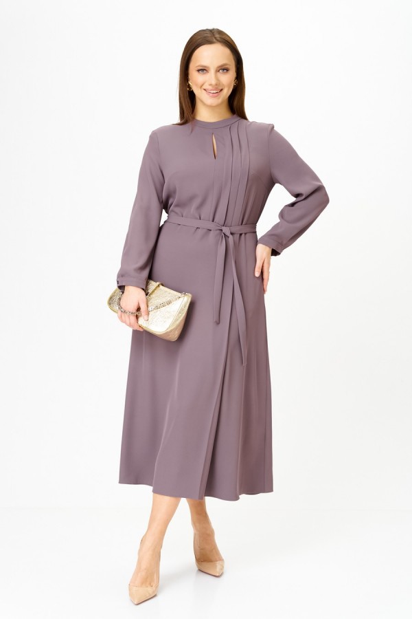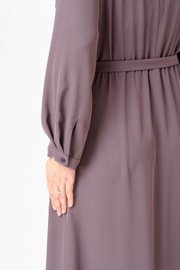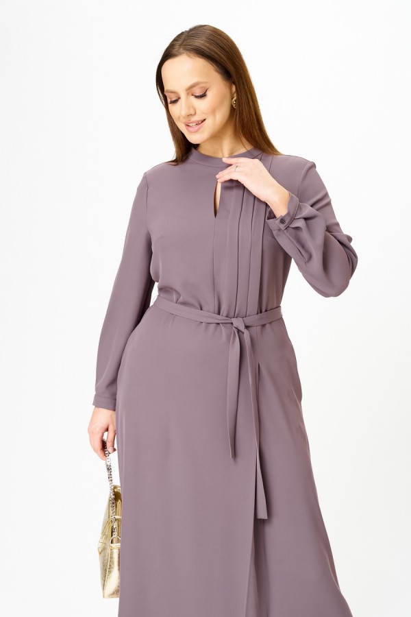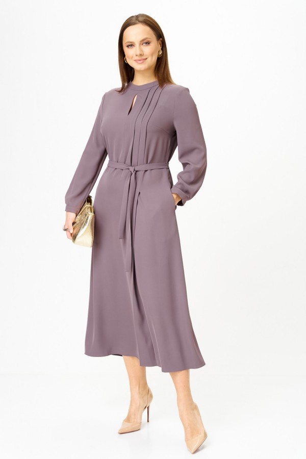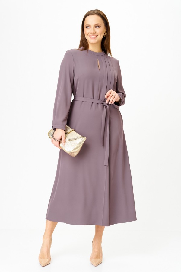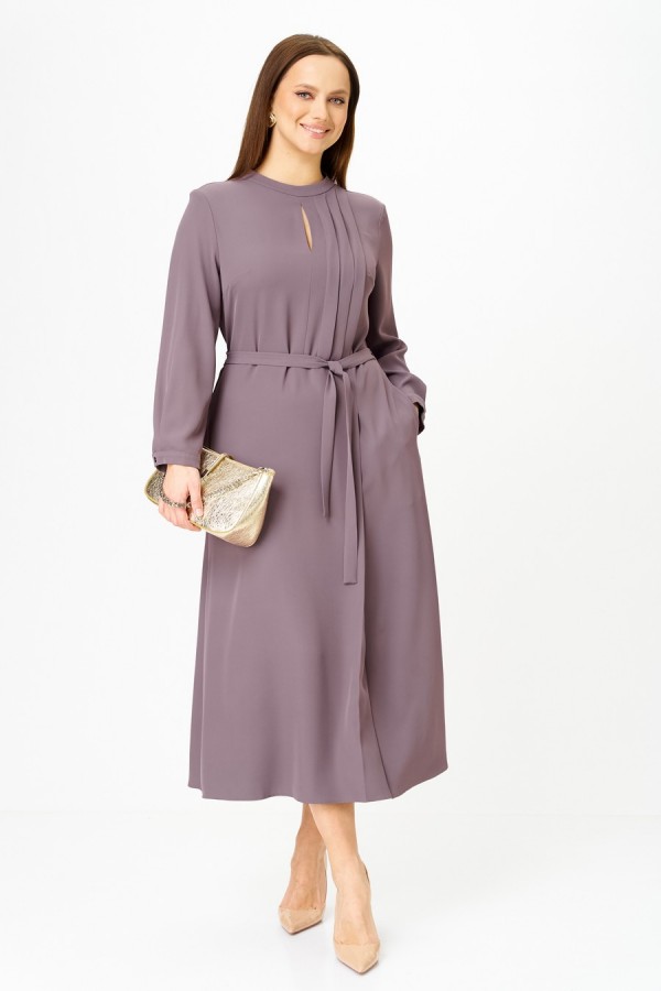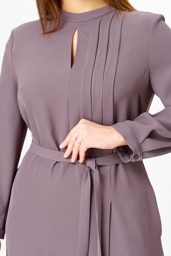 Платье женское полуприлегающего силуэта отрезное по линии талии, нижняя часть в виде расширенной к низу юбки миди. Лиф переда с ассиметричным элементом-вертикальные складки, по центру шов с небольшим разрезом выше линии груди, вытачки из боковых швов. По лифу спинки средний шов с разрезом и застежкой на навесную петлю и пуговицу. Горловина округлой формы, воротник-плосколежащая стойка. Рукав втачной одношовный на манжете. По нижней части переда ассиметричная глубокая складка, имитирующая запах. Нижняя часть спинки цельная. В боковых швах функциональные карманы. В комплекте сьемный пояс из основной ткани. Состав: полиэстер 97%, спандекс 3% Длина платья по спинке 125 см. Ширина изделия на уровне глубины проймы в 48р 102 см, в 50р 106 см, в 52р 110 см, в 54р 114 см. Длина рукава в 48-50р 56 см, в 52-54 57 см. Ширина изделия по линии талии в 48р 94 см, в 50р 98 см, в 52р 102 см, в 54р 106 см. Ширина изделия на уровне линии бедер в 48р 114 см, в 50р 118 см, в 52р 122 см, в 54р 126 см. Ширина рукава вверху в 48р 35 см, в 50р 37 см, в 52р 39 см, в 54р 41 см. Ширина рукава внизу в 48р 24 см, в 50р 24 см, в 52р 25 см, в 54р 25 см.