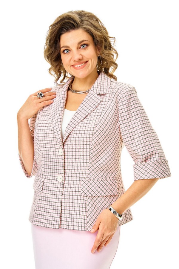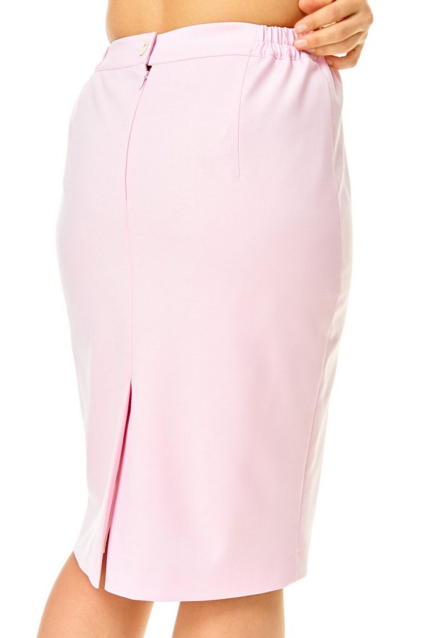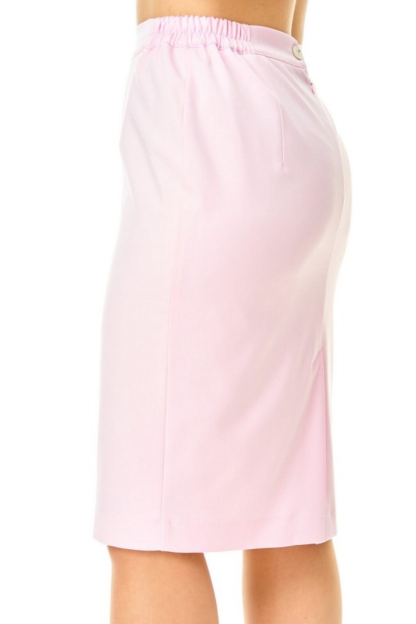 Костюм женский состоит из жакета и юбки. Жакет полуприлегающего силуэта с естественной линией плеча на подкладке.Спинка со средним швом и рельефами из плеча.Перед с рельефами из плеча, прорезными карманами "в рамку" и клапанами.Застежка центрально-бортовая на две петли-пуговицы.Воротник отложной пиджачного типа.Рукав коротки до линии локтя с отложной манжетой.Юбка на подкладке зауженного силуэта типа "карандаш".В среднем шве заднего полотнища застежка на потайную тесьму-молнию и шлица.Пояс притачной с резинкой в боковых швах.Таблица ЗАМЕРОВ готового изделия