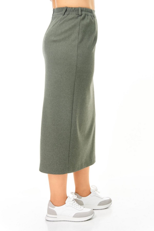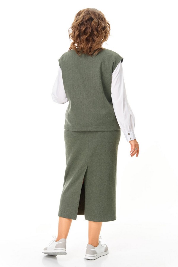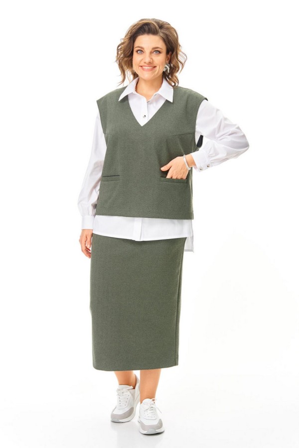 Комплект женский состоит из блузы, жилета и юбки. Блуза прямого свободного покроя с естественной линией плеча.Низ разноуровневый (спинка длиннее переда).В боковых швах разрезы.По переду обработана планка.Застежка центральная бортовая на петли и серебряные пуговицы.По спинке имеется отрезная кокетка и встречная складкаВоротник блузочный отложной.Рукав длинный, со сборкой по низу.Низ рукава обработан притачной манжетой с застёжкой на петли-пуговицы.Жилет свободного покроя со спущенной линией плеча.Горловина V-образной формы.По переду обработаны прорезные карманы с листочкой.Юбка прямого силуэта длинной миди.В среднем шве заднего полотнища обработана застежка на потайную тесьму-молнию и шлица.Пояс притачной с резинкой в боковых швах.