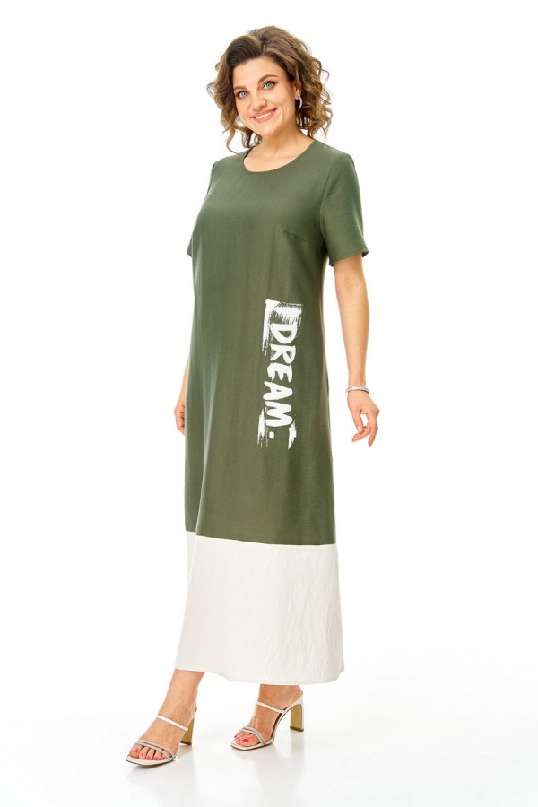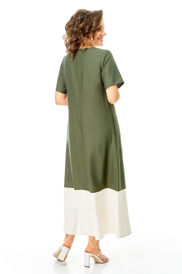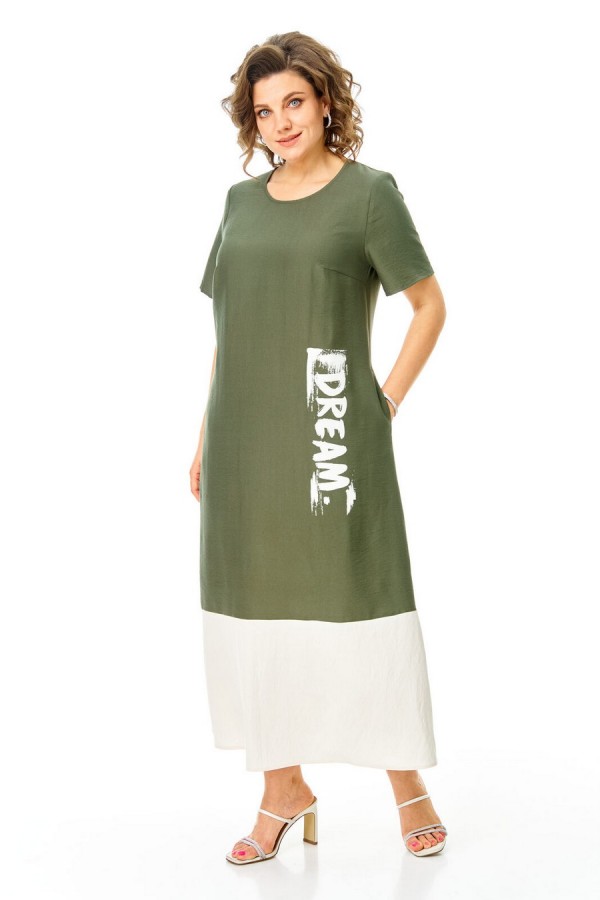 Платье женское А-образного силуэта с естественной линией плеча.Горловина округлой формы.В среднем шве спинки застежка на тесьму-молнию.Перед и спинка с отрезной нижней частью контрастного цвета.В боковых швах обработаны карманы.Рукав короткий одношовный.По переду нанесен авторский принт в цвет нижней части платья.