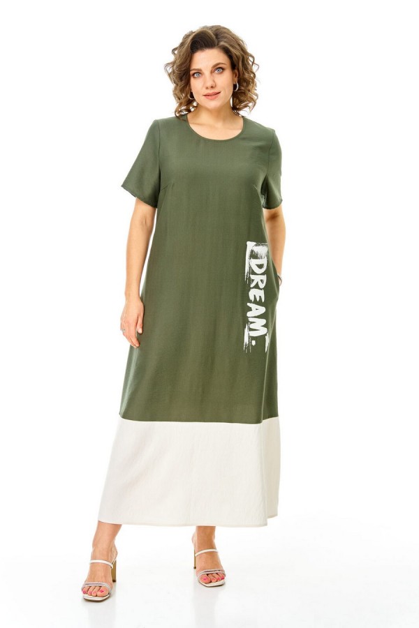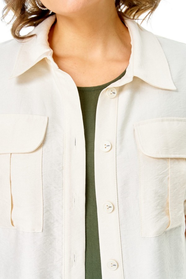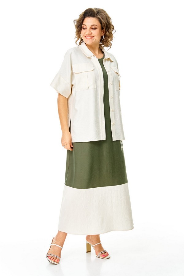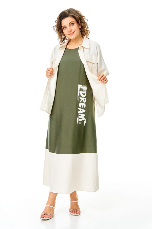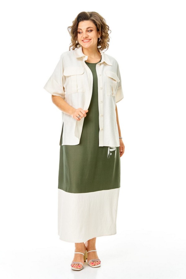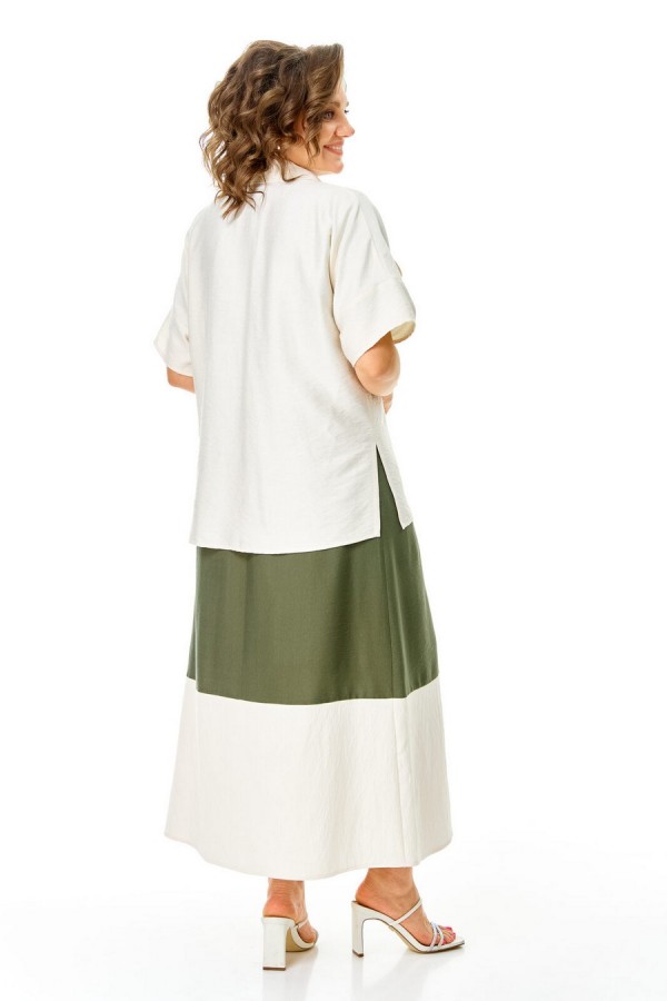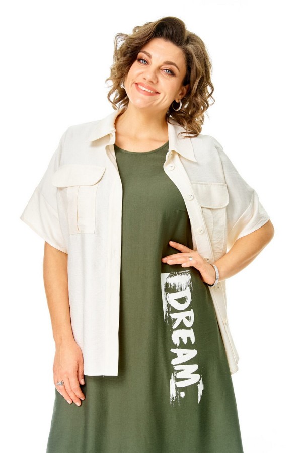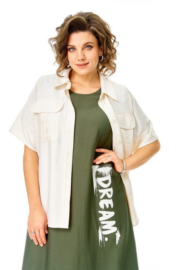 Комплект женский состоит из блузы и платья. Блуза прямого свободного покроя со спущенной линией плеча.По переду обработана планка.Застежка центральная бортовая на петли-пуговицы.Воротник блузочный отложной.Рукав короткий до линии локтя.По переду имеются накладные карманы с бантовыми складками и клапанами.В боковых швах обработаны разрезы.Платье женское А-образного силуэта с естественной линией плеча.Горловина округлой формы.В среднем шве спинки застежка на тесьму-молнию.Перед и спинка с отрезной нижней частью контрастного цвета.В боковых швах обработаны карманы.Рукав короткий одношовный.По переду нанесен авторский принт в цвет нижней части платья.