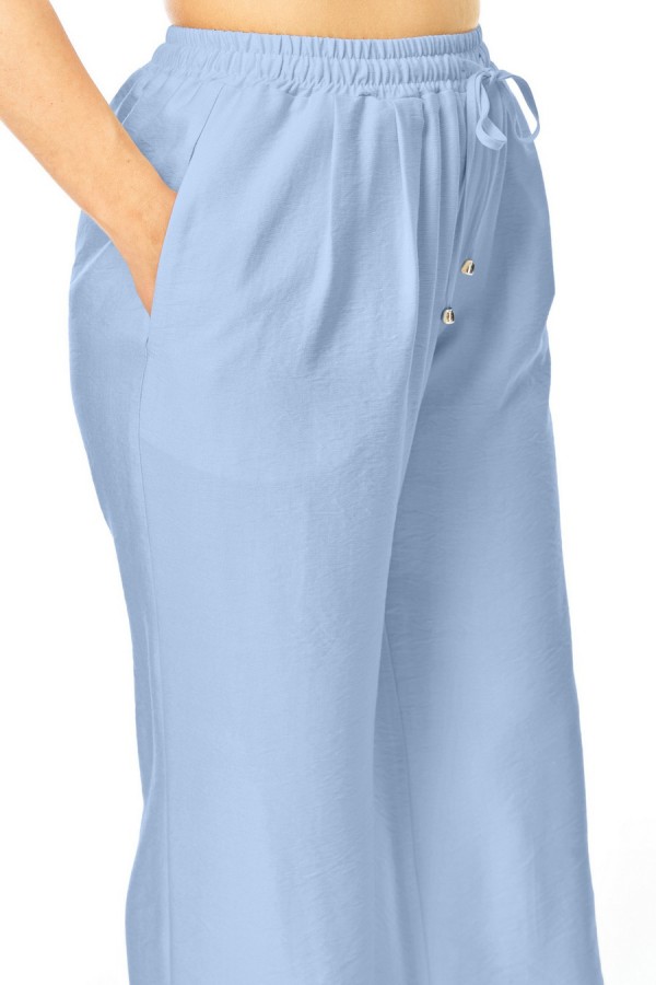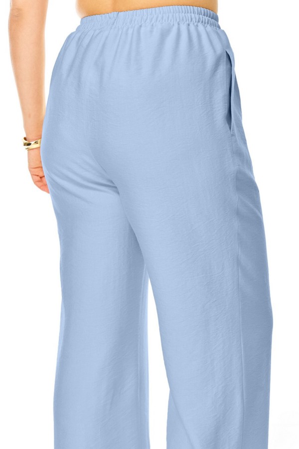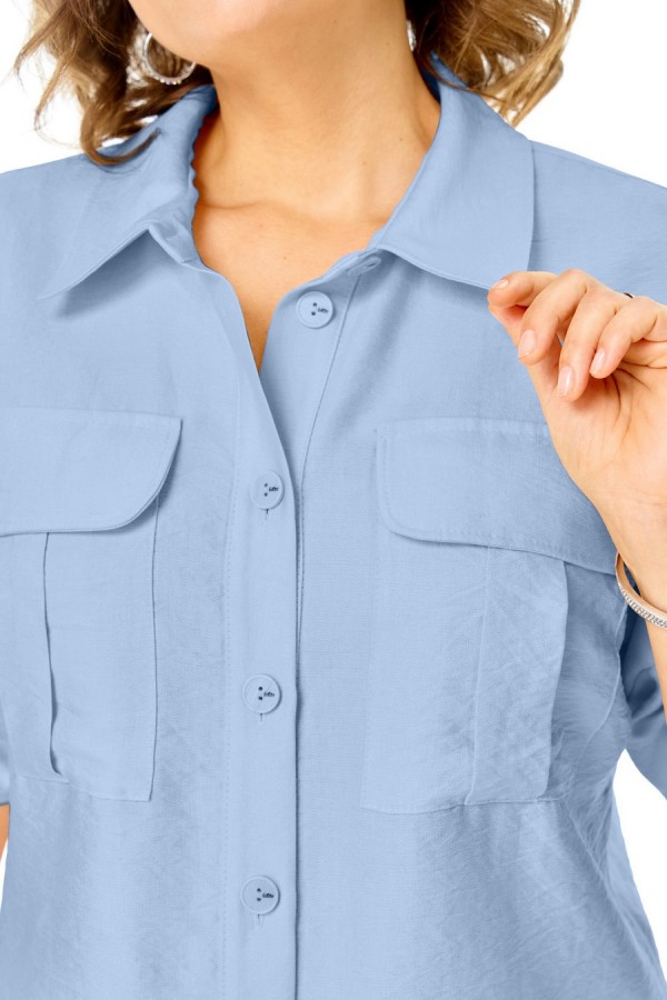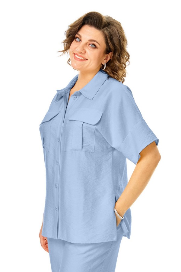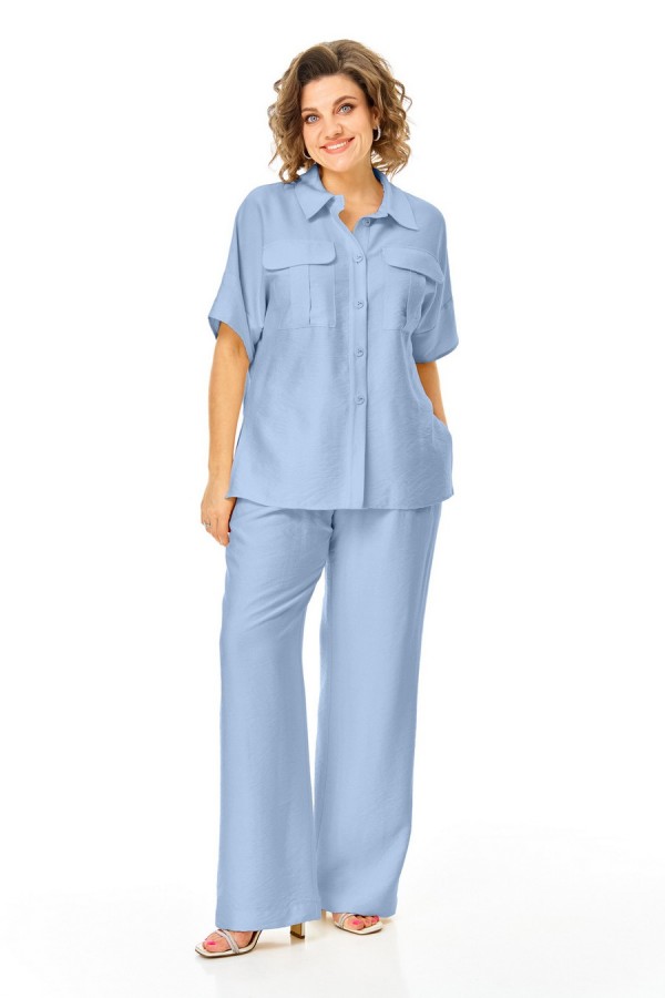 Комплект женский состоит из блузы и брюк. Блуза прямого свободного покроя со спущенной линией плеча.По переду обработана планка.Застежка центральная бортовая на петли-пуговицы.Воротник блузочный отложной.Рукав короткий до линии локтя.По переду имеются накладные карманы с бантовыми складками и клапанами.В боковых швах обработаны разрезы.Брюки свободные прямого силуэта.На передних половинках выполнены по две односторонние складки.Пояс притачной на резинке с втянутым шнуром.В боковых швах карманыТаблица ЗАМЕРОВ готового изделия