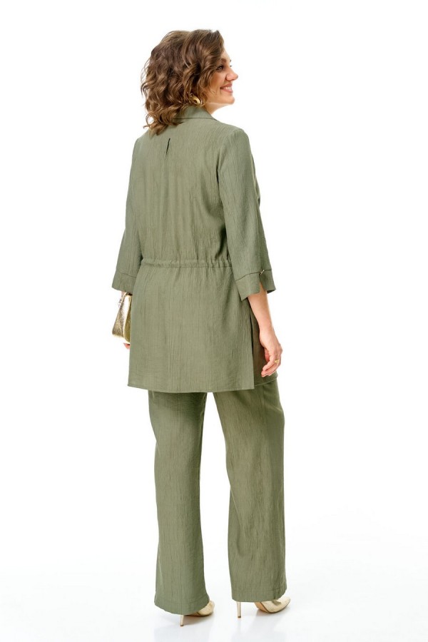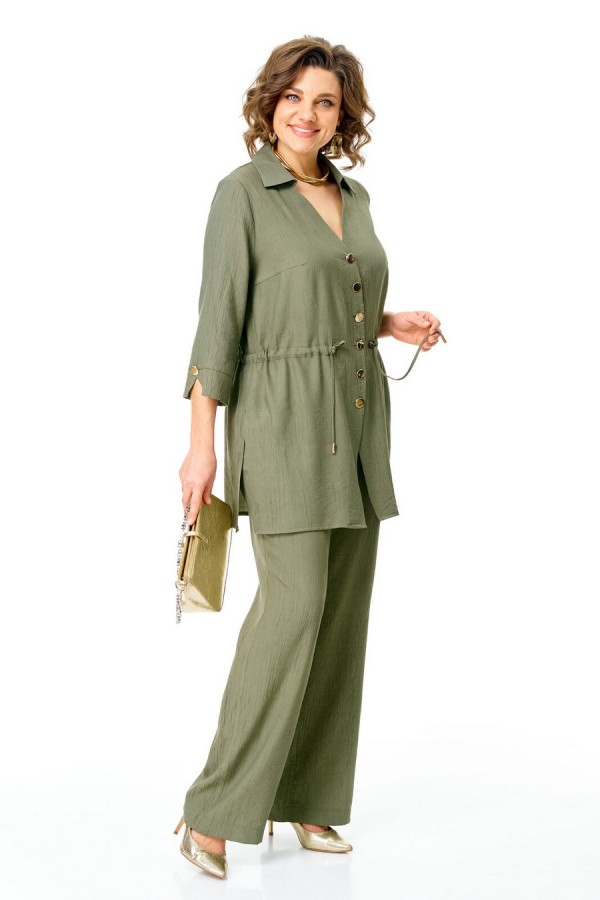 Костюм женский состоит из блузы и брюк. Блуза прямого свободного покроя с естественной линией плеча.Застежка фигурная, центральная бортовая на петли-пуговицы.Воротник блузочный, отложной.Рукав втачной одношовный, длинной 3/4.По низу рукава обработана притачная манжета с разрезом и декоративной пуговицей.Перед с нагрудными вытачками.По спинке и переду обработана кулиса, с втянутым шнуром с золотыми наконечниками.В боковых швах обработаны разрезы.Брюки свободные прямого силуэта.Пояс притачной на резинке.В боковых швах карманы.Таблица ЗАМЕРОВ готового изделия