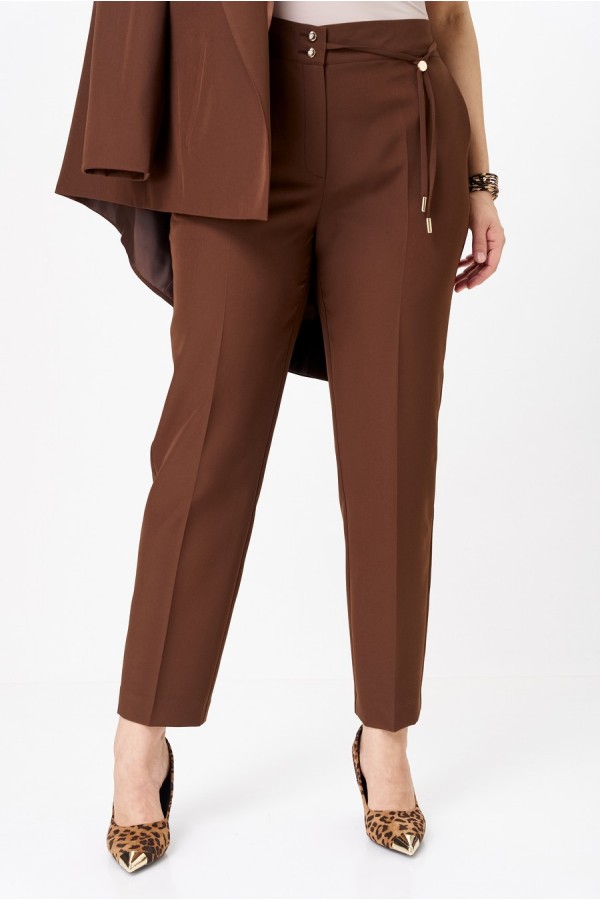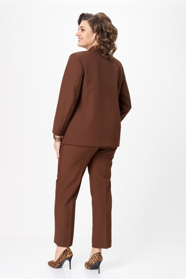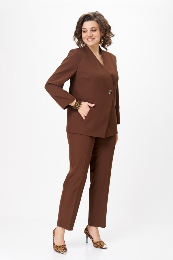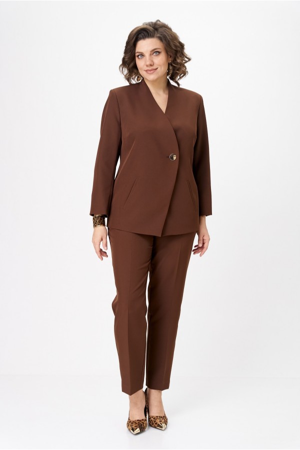 Костюм женский двухпредметный, состоящий из жакета и брюк. Жакет полуприлегающего силуэта со спущенной застежкой на одну декоративную петлю-пуговицу и одну потайную. Перед с отрезным бочком, в котором обработана вытачка, и с карманами с листочкой. Спинка со средним швом. Борт имеет фигурную форму. Горловина - по переду цельнокроенная стойка, а по спинке - отрезная со средним швом. Рукава втачные длинные двухшовные. Брюки классического кроя, зауженные к низу, с притачным поясом, от входа в карман вкруговую с широкой резинкой. Застежка на тесьму-молнию в средних срезах передних половинок и на 2 петли-пуговицы по поясу. Также по поясу вставлен шнурок с фиксатором и наконечниками. Карманы наклонные к боковому шву. На брюках заутюжены канты.