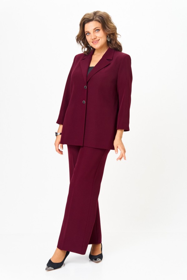 Костюм женский двухпредметный, состоящий из жакета и брюк. Жакет полуприлегающего силуэта, удлиненный, с центральной бортовой застежкой на 2 петли-пуговицы до линии перегиба лацкана. Перед с нагрудными вытачками, выходящими из горловины. Боковые швы с разрезами, между которыми по спинке вставлен пояс фигурной формы с декоратичной нашивкой. Спинка со средним швом. Воротник пиджачного типа. Рукава втачные двухшовные длиной 3/4. Брюки палаццо с притачным широким поясом на резинке от заутюженных стрелок по передней половинке вкруговую. Застежка на тесьму-молнию в средних срезах передних половинок брюк и 2 петли-пуговицы по поясу.