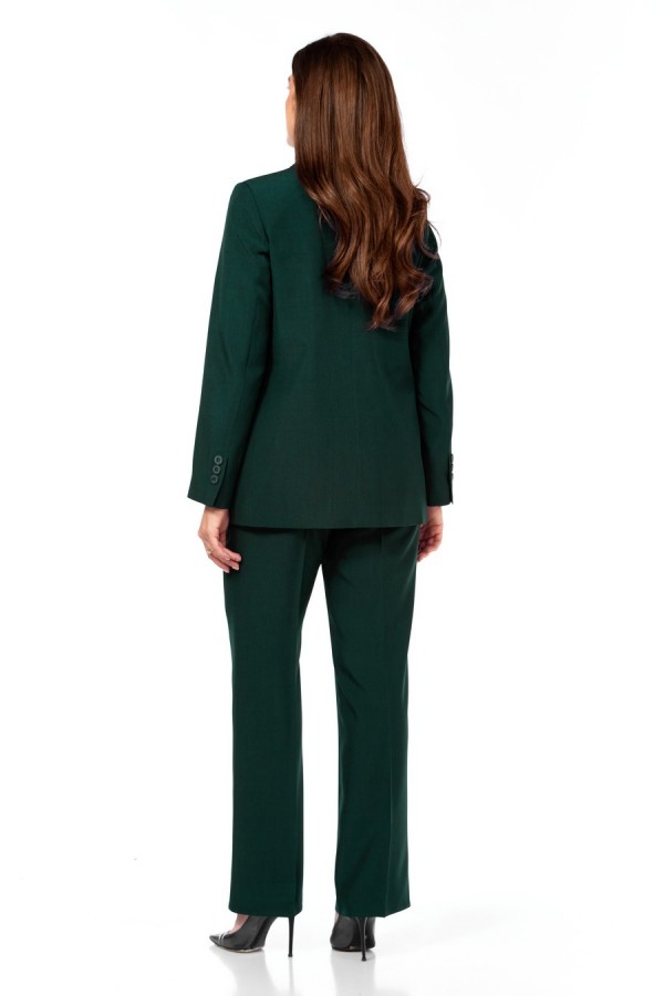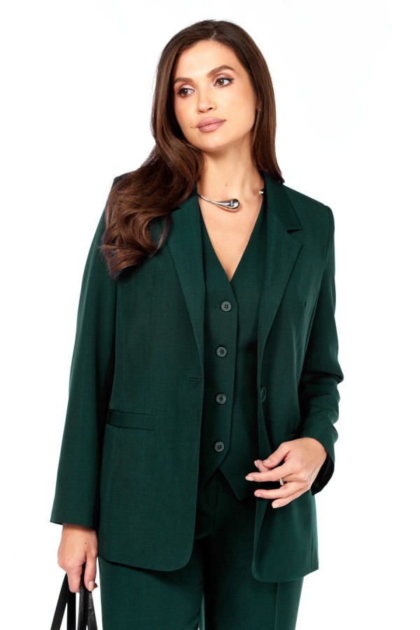 Костюм женский 3-х предметный, полуприлегающего силуэта. Состоит из жакета и жилета на подкладке и брюк. Жакет с воротником пиджачного типа, центральной застёжкой на 1 петлю и 1 пуговицу. Перед с рельефными швами от пройм до низа и талиевыми вытачками и прорезными карманами с листочками с втачными концами. Спинка со средним швом. Рукав втачной, двухшовный, длинный со шлицей. Жилет с рельефными швами от пройм до низа по переду и спинке, с центральной застёжкой на 4 петли и 4 пуговицы. Перед с прорезными карманами с листочками с втачными концами. Брюки с застёжкой на тесьму "молнию" в средних срезах передних половинок, с притачным поясом на 1 петлю и 1 пуговицу и резинкой по задним половинкам, с карманами наклонными к боковым швам. По передним и задним половинкам заутюженные канты. Длина жакета по спинке - 70 см. Длина рукава - 61 см. Длина жилета по спинке - 53 см. Длина брюк по боковому шву - 101 см.