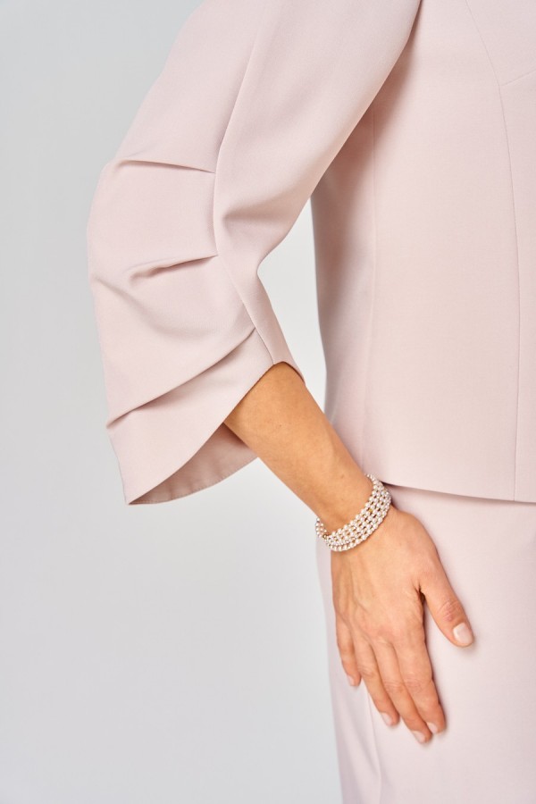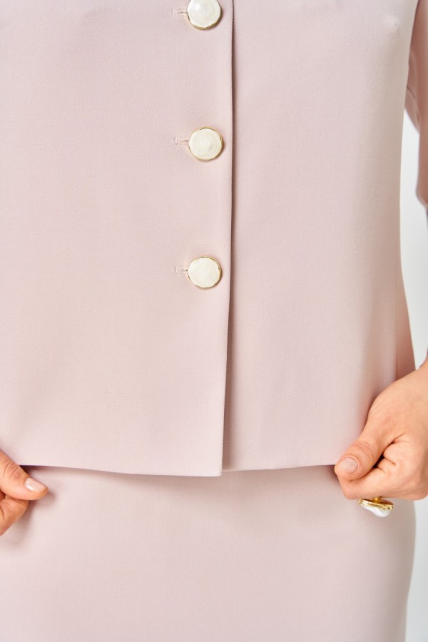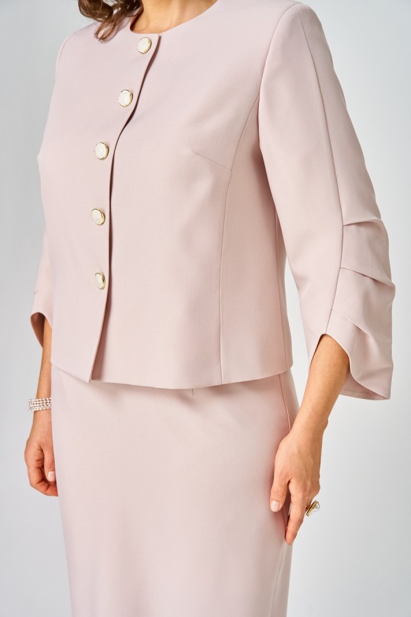 Костюм женский двухпредметный, состоящий из жакета и юбки. Жакет укороченный, на подкладке, с центральной бортовой застежкой на 5 петель-пуговиц. Перед с отрезным бочком и нагрудной вытачкой. Спинка со средним швом. Горловина овальной формы. Рукава 3-шовные с тремя складками по среднему шву рукава и фигурнооформленным низом, укороченные. Воротник объемный декоративный, с кружевом и бусинами. Юбка зауженная к низу длиной за колено с притачным поясом. На участках от вытачки переднего полотнища до вытачки заднего полотнища вставлена эластичная тесьма-резинка. В боковом шве по низу изделия обработана потайная тесьма-молния, для эффекта - разрез. Застежка в среднем шве заднего полотнища на петлю-пуговицу и потайную тесьму-молнию.