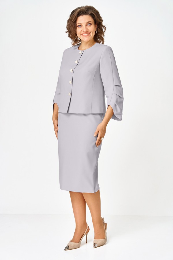 Костюм женский двухпредметный, состоящий из жакета и юбки. Жакет укороченный, на подкладке, с центральной бортовой застежкой на 5 петель-пуговиц. Перед с отрезным бочком и нагрудной вытачкой. Спинка со средним швом. Горловина овальной формы. Рукава 3-шовные с тремя складками по среднему шву рукава и фигурнооформленным низом, укороченные. Юбка зауженная к низу длиной за колено с притачным поясом. На участках от вытачки переднего полотнища до вытачки заднего полотнища вставлена эластичная тесьма-резинка. В боковом шве по низу изделия обработана потайная тесьма-молния, для эффекта - разрез. Застежка в среднем шве заднего полотнища на петлю-пуговицу и потайную тесьму-молнию.