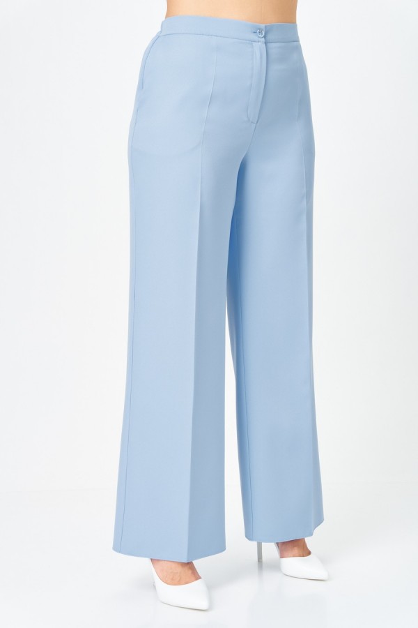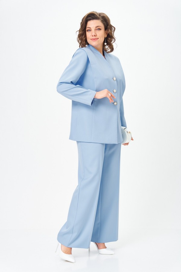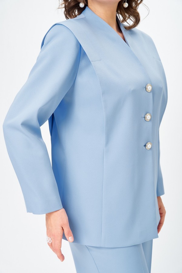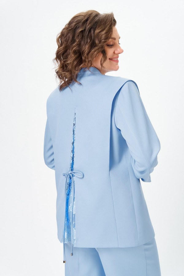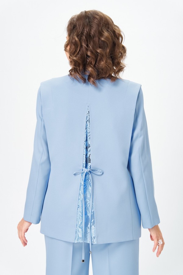Костюм женский двухпредметный, состоящий из жакета и брюк. Жакет полуприлегающего силуэта, на подкладке, с центральной бортовой застежкой на 3 петли-пуговицы. Линия борта имеет фигурную форму. Жакет с отлетными деталями, идущими от плеча в рельефные швы спинки и переда и закрепленными в верхней части отделочными строчками. Спинка со средним швом и клином из кружевной ткани, которая фиксируется завязками из окантовки. Воротник - цельнокроенная стойка по переду и отрезная со швом по спинке. Рукав втачной длинный двухшовный. Брюки палаццо с притачным поясом сзади на резинке. Застежка на тесьму-молнию и 1 петлю-пуговицу по поясу. На брюках заутюжены стрелки и обработаны карманы на передних половинках, наклонные к боковым швам.