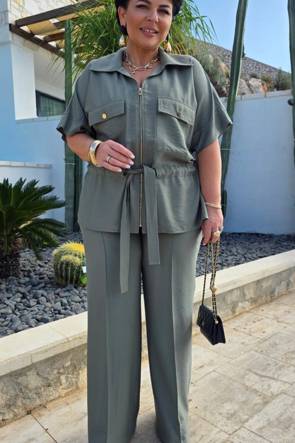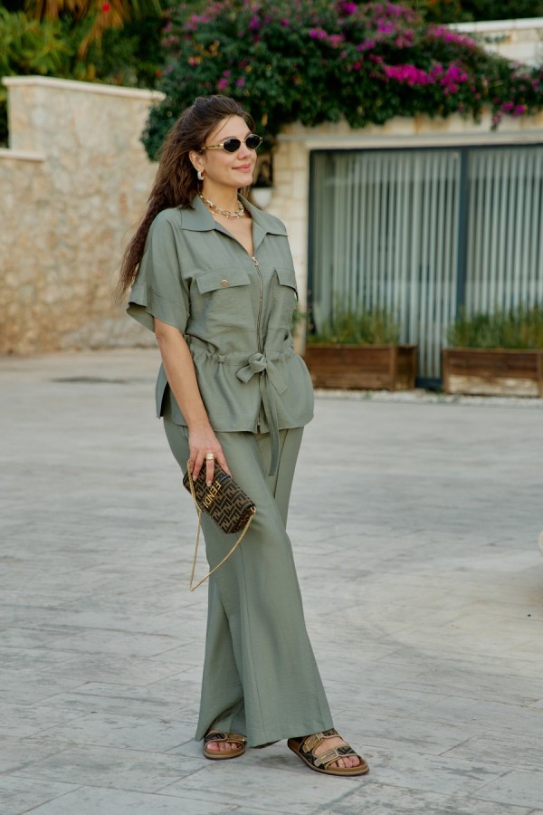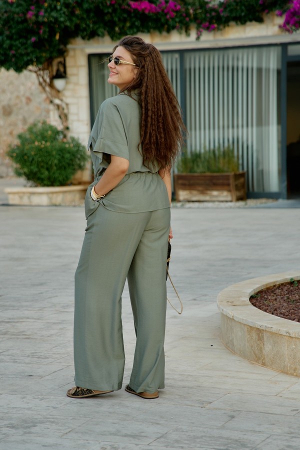 Состав: 83% вискоза, 17% нейлон. Летние брюки цвета хаки — это не просто предмет гардероба, а инструмент самовыражения. Они сочетают в себе практичность и элегантность городских брюк, натуральность оттенков и универсальность нейтральной палитры. Эти брюки подходят для женщины, которая не делит жизнь на "повседневное" и "особенное" — для неё каждый день может быть особенным, если правильно его одеть. Они говорят: "Я готова к приключениям, но делаю это стильно". В конце концов, настоящий стиль — это не про следование правилам, а про умение создавать свои, и брюки цвета хаки дают для этого идеальный холст. Сочетания: с спортивным топом — для активного дня; с oversize — расслабленный вайб; с футболкой с графическим принтом — молодёжный дух. Брюки прямого силуэта с притачным поясом на эластичной тесьме-резинке, что обеспечивает максимально удобную посадку на любой тип фигуры. По переду брюк застрочены «кантики». Это конструктивный приём, который позволяет визуально вытягивать фигуру. По переду брюк наклонные карманы. Длина брюк 108 см.