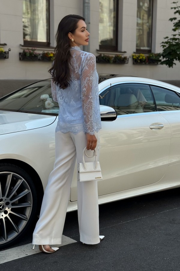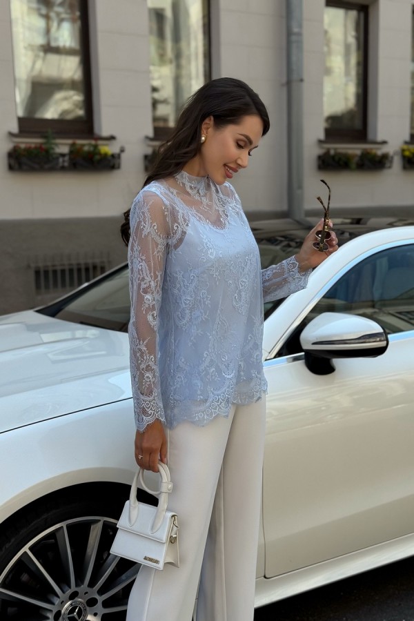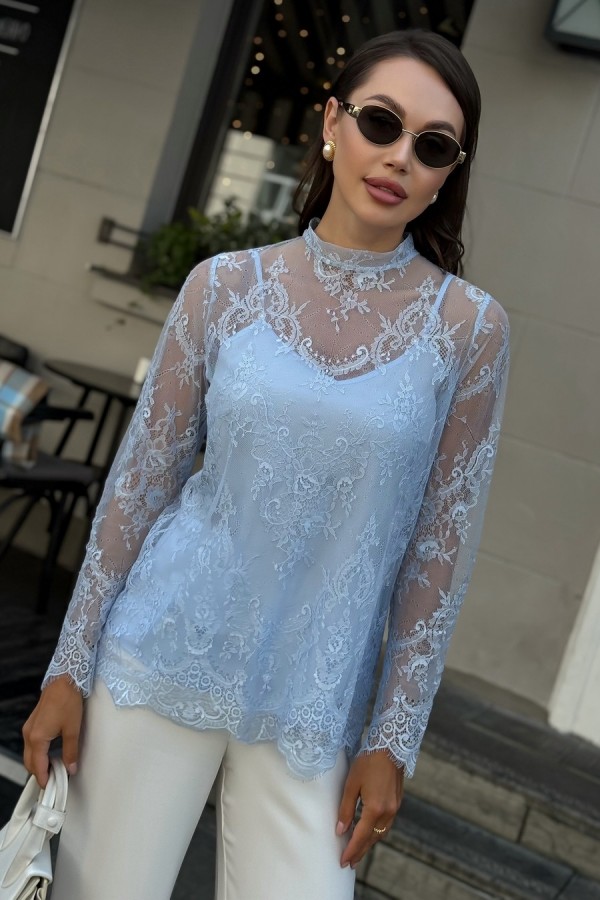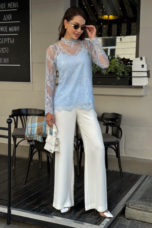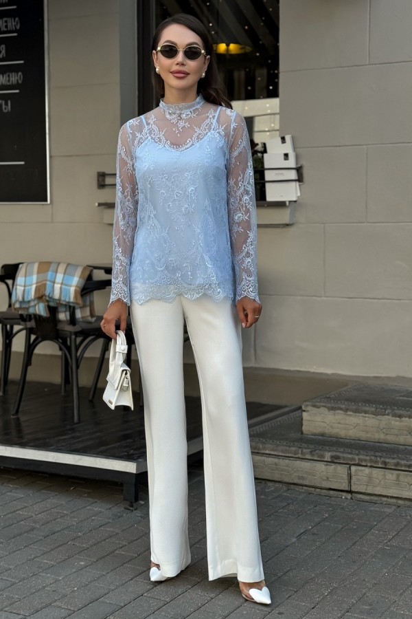 Блузка женская нарядная из гипюра с топом — комплект 2 в 1 для особых случаев Эта нарядная женская блузка из нежного гипюра — идеальное решение для торжественного образа. Комплект женский 2-х предметный, состоящий из блузы и топа, предназначен как для нарядной, так и для повседневной носки. Блуза женская полуприлегающего силуэта, выполнена из гипюровой ткани. Перед и спинка цельные, без вытачек. Спинка от горловины с застежкой на 1 навесную петлю и пуговицу (размер и цвет фурнитуры может незначительно отличаться от фото). Горловина с воротником-стойкой, с обтачными концами по спинке. Рукава втачные, одношовные, длинные. Низа переда, спинки, рукавов оформлены фестонами. Топ женский, 2-х слойный, полуприлегающего силуэта, на регулируемых бретелях. Верхний и нижний слои выполнены из блузочной ткани. Перед с нагрудными вытачками, выходящими из боковых швов. Низ переда и спинки фигурной формы.Состав блузы: полиэстер - 95%, спандекс - 5%; Состав топа: полиэстер - 95%, спандекс - 5%; Тип ткани блузы: гипюр. Тип ткани топа: блузочная.