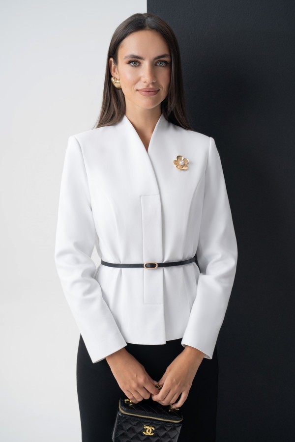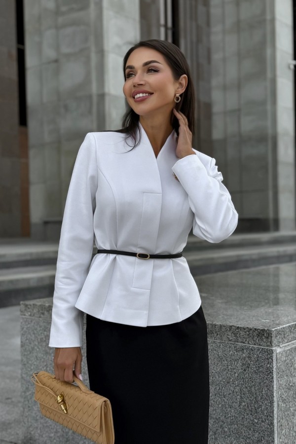Женский костюм с юбкой URS — это воплощение элегантности, утончённого вкуса и уверенности в себе. Такой деловой костюм с юбкой подойдёт для офиса, переговоров, деловых встреч, конференций, официальных мероприятий. Он сочетает в себе строгость классического силуэта и женственность мягких линий. Костюм женский ЮРС, 2-х предметный, состоящий из жакета и юбки, выполнен из трикотажного полотна, со съемным декоративным поясом, нарядный. Жакет женский полуприлегающего силуэта, на подкладке, с центральной бортовой потайной застежкой на 2 петли и пуговицы (размер и цвет фурнитуры может незначительно отличаться от фото). Перед с рельефными швами. Спинка со средним и рельефными швами. Рукава втачные, двухшовные, длинные. Горловина ˅- образная, переходящая в воротник - стойку по спинке. Жакет с плечевыми накладками. Юбка прямого силуэта, зауженная к низу, на притачном поясе, застегивающимся на 1 петлю и пуговицу. Переднее и заднееполотнища с талиевыми вытачками. Заднее полотнище со средним швом, в верхней части которого обработана застежка на потайную тесьму - молнию, в нижней – шлица. Юбка на отлетной по низу подкладке. С 50 размера в поясе, на уровне боковых швов предусмотрены резинки для лучшего прилегания по талии. Состав ткани Состави изделия: полиэстер - 76%, вискоза - 20%, эластан - 4%. Состав подкладки: полиэстер - 96%, спандекс - 4%. Тип ткани трикотажное полотно